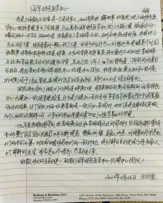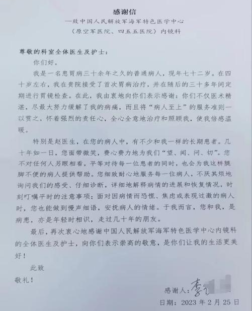 “你们不仅医术精湛,尽最大努力缓解了我的病痛,而且将‘病人至上’的服务准则一以贯之,怀着强烈的责任心,全心全意地治疗和照顾我,使我倍感温暖。”近日,两封感谢信让海军特色医学中心消化内科医护人员感到无比暖心。笔墨虽浅,情意却浓,字里行间洋溢着对医护人员的信任、感谢和对医院服务的赞扬。