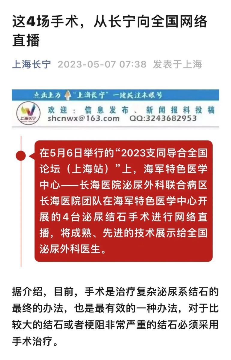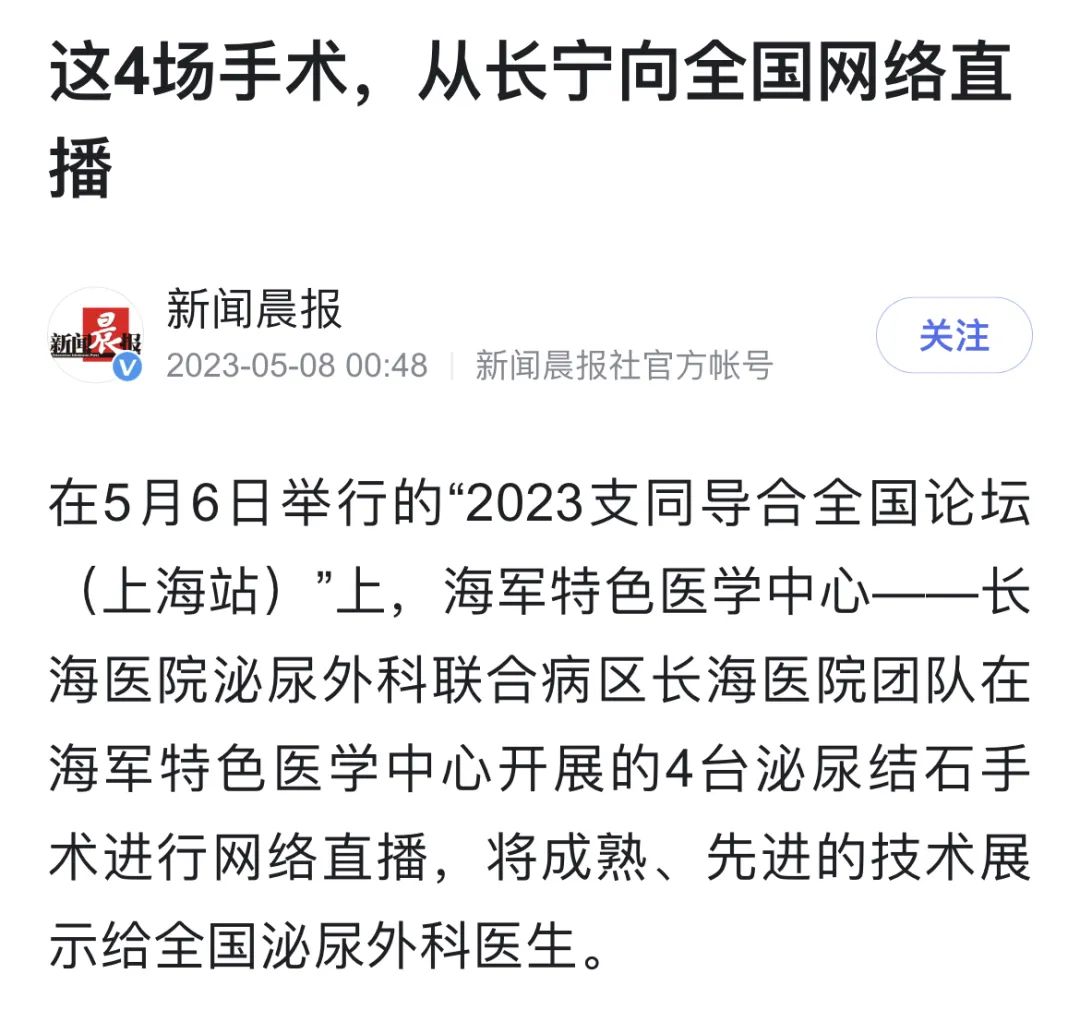 5月6日,在“2023支同导合全国论坛(上海站)”上,海军特色医学中心——长海医院泌尿外科联合病区长海医院团队在中心开展的4台泌尿结石手术在网络上进行了直播。上海长宁融媒体、新闻晨报、东方新闻、周到上海等媒体对手术进行了转载报道。