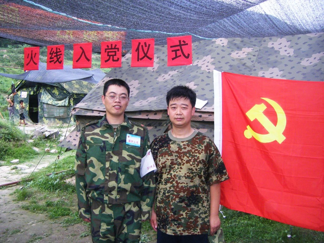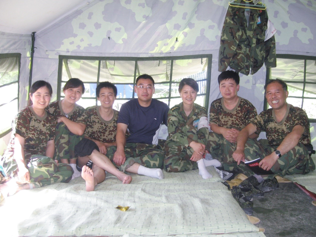 当日深夜抵达四川平武县任务区,一部分队员立即进入山区搜寻伤病员,其他队员开始搭建营地。刚开始两个星期,八个队员住一个帐篷,睡在坑洼不平的地面上,时刻感受余震的威胁,虽然顿顿方便面,但我们士气高昂,一批批伤员得到了救治,当地的灾民也得到了医疗防疫保障。